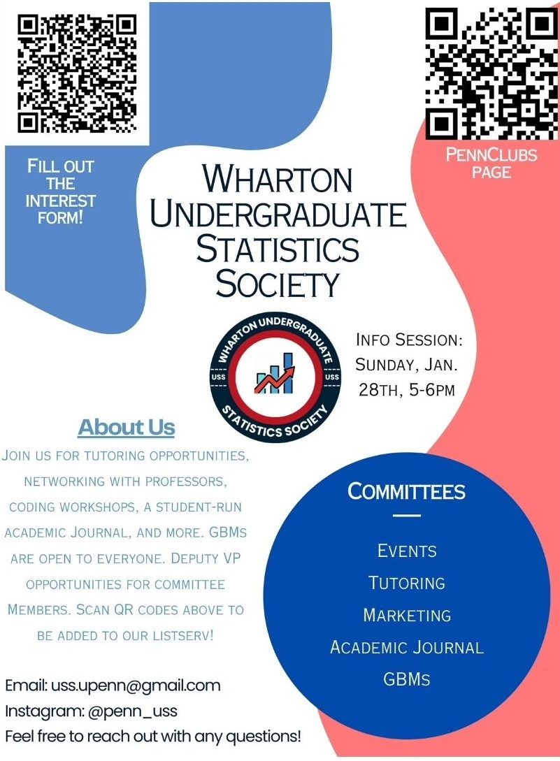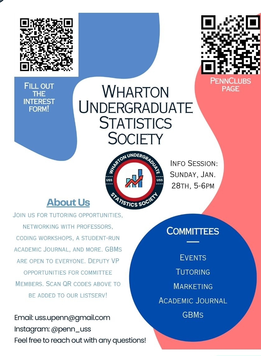 Wharton USS Information Session 30Jan 20248 Jul 2024Add a comment The application to the Wharton Undergraduate Statistics Society is open and due Feb 2nd! Penn students can apply through the Penn Clubs application. Join us for our second virtual information section this week, Wednesday Jan 31st at 5:30pm. Share this: Click to share on X (Opens in new window) X Click to share on Facebook (Opens in new window) Facebook Like Loading...