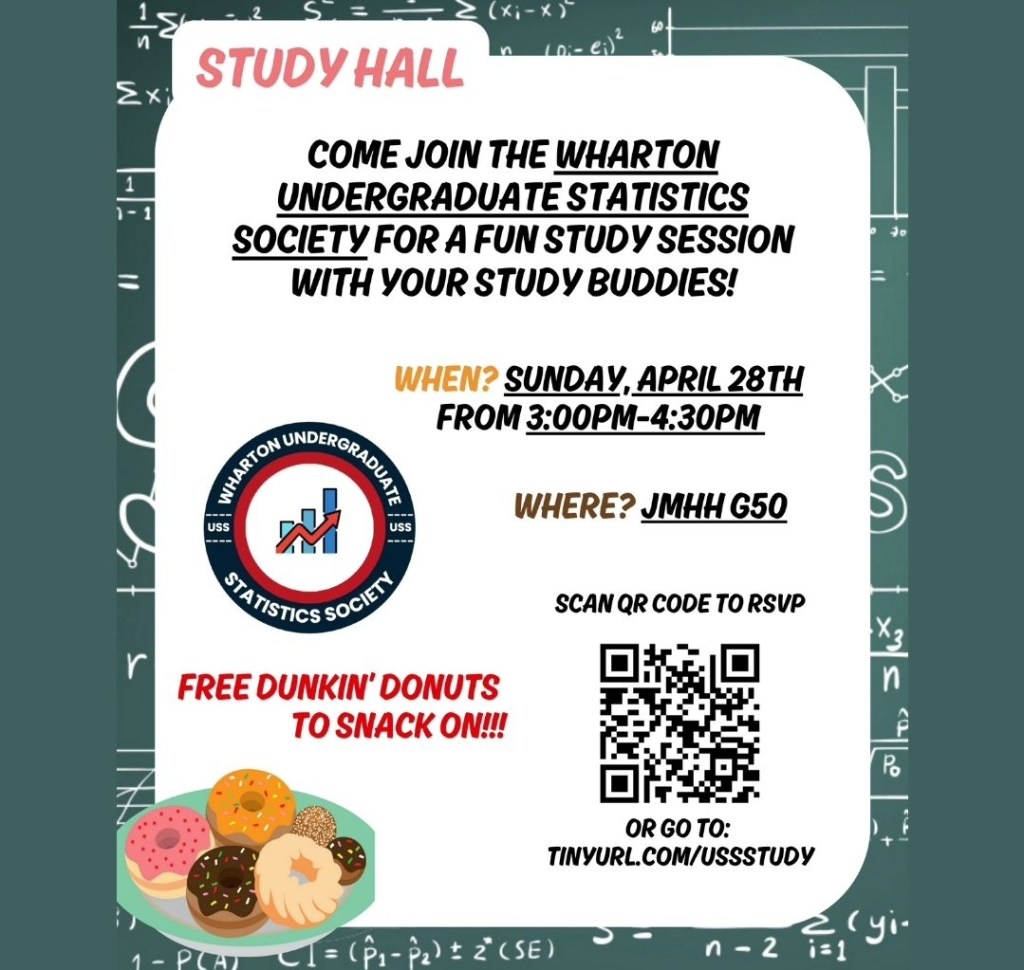 Wharton USS Study Hall 28Apr 20248 Jul 2024Add a comment Join our Study Hall to celebrate the end of the semester and study for finals at our event! Free donuts will be available, RSVP using the link in our Instagram bio (or scan the QR code!). Share this: Click to share on X (Opens in new window) X Click to share on Facebook (Opens in new window) Facebook Like Loading...